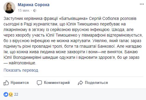 "Заместитель руководителя фракции "Батькивщина" Сергей Соболев рассказал сегодня в Раде журналистам, что Юлия Тимошенко находится на больничном в связи с серьезной вирусной инфекцией. Жаль, но из-за болезни участие Юлии Тимошенко в полумарафоне откладывается, ибо с вирусной инфекцией нельзя шутить. Представляю, какой шум сейчас поднимут различные провластные тролли, боты и глашатаи Банковой. Но напомню им, что каждый живой человек может заболеть и они - не исключение. Желаю Юлии Владимировне быстрее выздороветь и восстановить здоровье, потому что это сейчас - самое главное", - заявила Сорока.