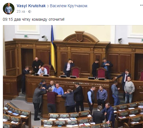 "09.15 дали команду окружить", - написал Крутчак. Это 15 депутатов Верховной Рады от фракции "Блок Петра Порошенко" заблокировали парламентский президиум и трибуну с целью недопущения блокирования их фракцией "Самопомич" и другими депутатами.