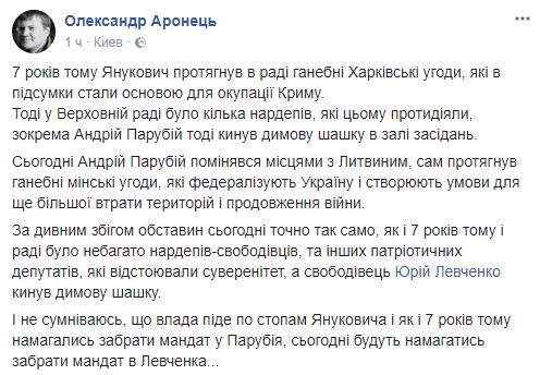 "7 лет назад Янукович протянул в Раде позорные Харьковские соглашения, которые в итоге стали основой для оккупации Крыма. Тогда в Верховной Раде было несколько нардепов, которые этому противодействовали, в частности Андрей Парубий тогда бросил дымовую шашку в зале заседаний. Сегодня Андрей Парубий поменялся местами с Литвиным, сам протянул позорные минские соглашения", - пишет свободовец Александр Аронец.
