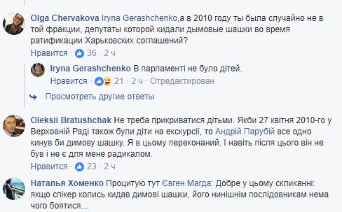 "Iryna Gerashchenko, а в 2010 году ты была случайно не в той фракции, депутаты которой кидали дымовые шашки во время ратификации Харьковских соглашений?", - написала журналистка Ольга Червакова под постом вице-спикера, где та возмущалась дымовой шашкой в Раде.