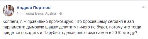 "Коллеги, я ж правильно прогнозирую, что бросившему сегодня в зал парламента дымовую шашку депутату ничего не будет, потому что тогда придется посадить и Парубия, сделавшего тоже самое в 2010-м году?", - написал у себя в Facebook известный юрист Андрей Портнов.