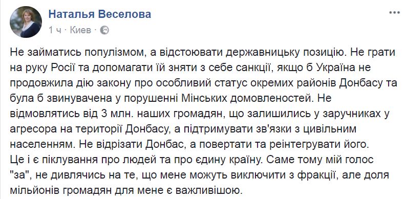 Сама Веселова пояснила в Facebook, что если бы Рада не приняла этот закон, Россия смогла бы снять с себя санкции. Кроме того, Украину обвинили бы в нарушении Минских договоренностей.