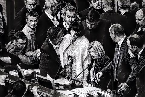 Ставшую известной вчера фотографию из зала Верховной Рады, где толпа депутатов, блокировавшая трибуну, окружила опустившую глаза Татьяну Черновол (автор фото  - Анна Грабарская), мы прогнали через фильтры известной программы Prizma, которая стилизует фото под картинки знаменитых художников, виды и стили живописи и графики.