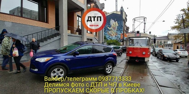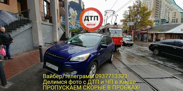 Сегодня, 9 октября, в Киеве на улице Дмитриевской автомобиль с дипломатическими номерами стал причиной крупного затора трамваев. Об этом сообщает Влад Антонов и публикует соответствующее фото на своей странице в Facebook.