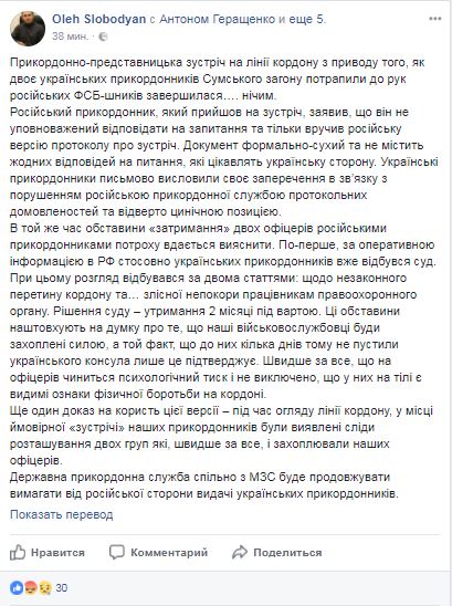 Кроме того, Слободян отметил, что сегодняшняя погранично-представительская встреча на линии границы по поводу того, как двое украинских пограничников Сумского отряда попали в руки российских ФСБ-шников завершилась.... ничем.