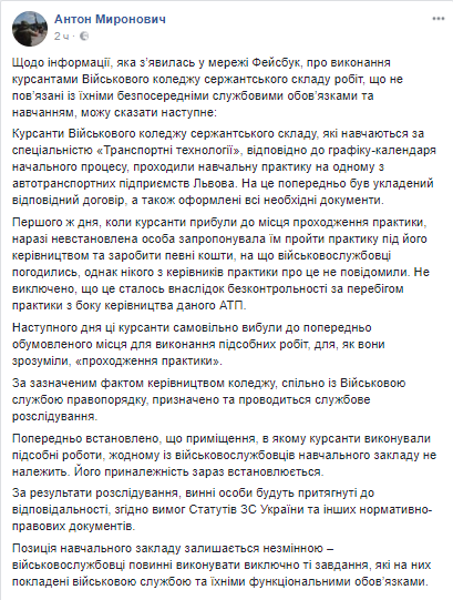 Во Львове курсанты Военного колледжа сержантского состава уклонились от прохождения учебной практики в одном из автотранспортных предприятий. Об этом сообщает спикер пресс-центра штаба АТО Антон Миронович в Facebook.