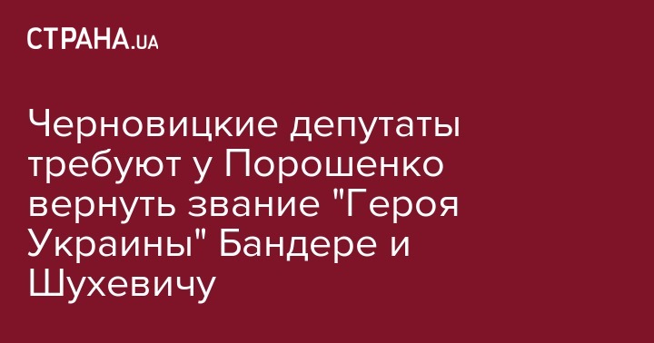 Решение об обращении к президенту Петру Порошенко с призывом вернуть проводникам ОУН-УПА Степану Бандере и Роману Шухевичу звания "Герой Украины" принял Черновицкий городской совет. Об этом пишет "УНИАН".
