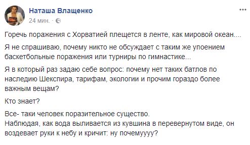 "Горечь поражения с Хорватией плещется в ленте, как мировой океан.... Я не спрашиваю, почему никто не обсуждает с таким же упоением баскетбольные поражения или турниры по гимнастике... Я в который раз задаю себе вопрос: почему нет таких батлов по наследию Шекспира, тарифам, экологии и прочим гораздо более важным вещам?", - излагает женский взгляд на проблему телеведущая Наталья Влащенко.