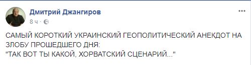 А политолог Дмитрий Джангиров в шутку назвал произошедшее "хорватским сценарием". Таким словосочетанием называют события в Хорватии 1995 года - когда хорватская армия одним мощным ударом ликвидировала сепаратистское образование Сербскую Краину. "Хорватский сценарий" - любимый мэм сторонников силового решения вопроса с сепаратистскими территориями Донбасса.