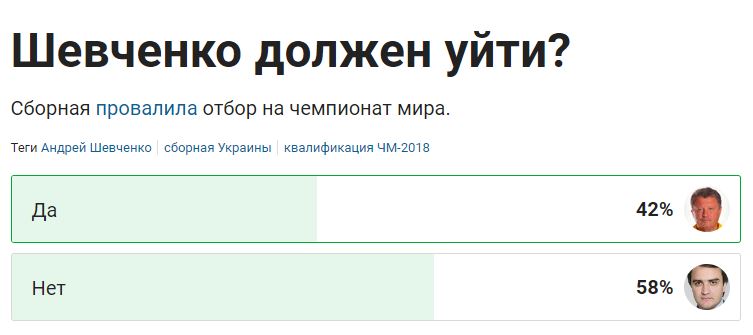В то же время, фанаты футбола на сайте "Трибуна" решили не отправлять в отставку Андрея Шевченко - тренера украинской сборной.