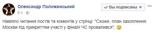 "Похоже, план захвата Москвы под прикрытием участия в финале ЧМ провалился", - повернул ситуацию по другому певец и шоумен Сашко Положинский.