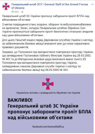Генеральный штаб Вооруженных сил Украины предлагает запретить пролет беспилотных летающих объектов над военными объектами. Об этом сообщается на странице Генштаба ВСУ в Facebook.