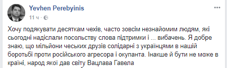 "Хочу поблагодарить десятки чехов, часто совершенно незнакомых людей, которые сегодня направили посольству слова поддержки и... извинений", – написал посол в Facebook.