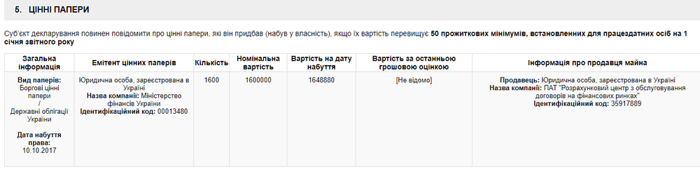 Согласно предоставленной нардепом информации, 10 октября он приобрел 1,6 тысячи государственных облигаций, выпущенных Министерством финансов, за 1,649 миллиона гривен.