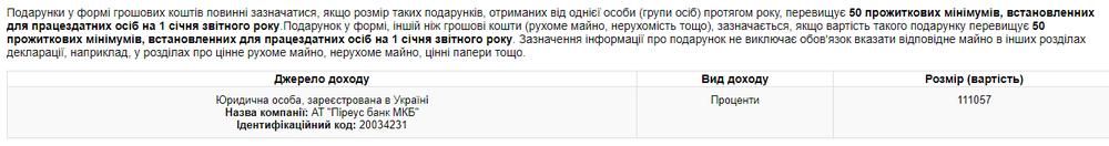 Также в декларации говорится, что Пинзеник недавно получил 111 тысяч гривен процентов по вкладу в Пиреус банке.