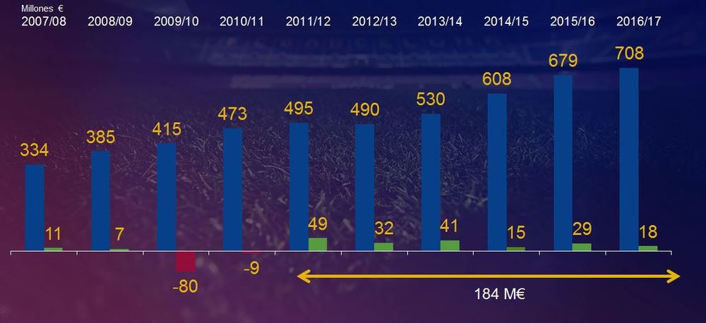 Так, согласно графику, доход каталонского клуба составил рекордные 708 миллионов евро, расходы – 677 млн, а чистая прибыль – 31 млн. Но, если вычесть налоги, то чистая прибыль "блаугранас" в прошлом году составила лишь 18 млн евро.