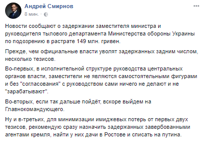 "Прежде, чем официальные власти уволят задержанных задним числом, несколько тезисов. Во-первых, в исполнительной структуре руководства центральных органов власти, заместители не являются самостоятельными фигурами и без "согласования" с руководством сами ничего не делают и не "зарабатывают". Во-вторых, если так дальше пойдет, вскоре выйдем на Главнокомандующего. Ну и в-третьих, для минимизации имиджевых потерь от первых двух тезисов, рекомендую сразу назначить задержанных завербованными агентами Кремля, найти у них дачи в Ростове и списать на Путина", - отметил он на своей странице в Facebook.