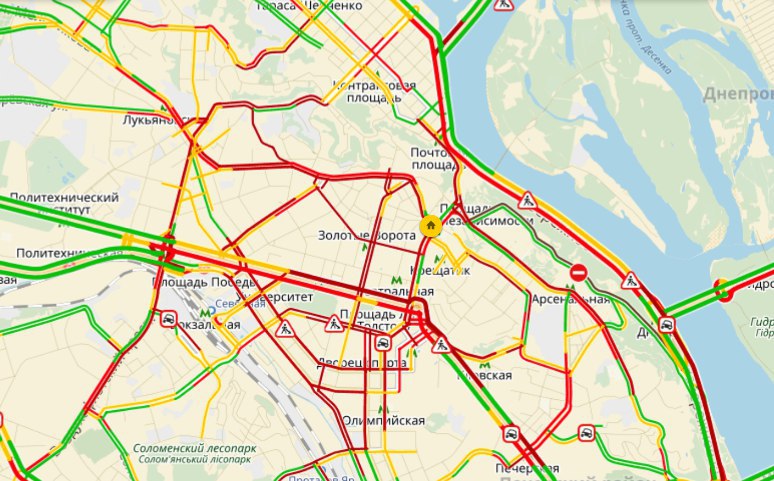 Проблемы с проездом наблюдаются в районе станций метро в центре, кроме того, имеются проблемы с движением на улице Большая Житомирская, на улицах Ярославов Вал, Михаила Грушевского и Владимирской. Пробка образовалась на проспекте Победы (от центра и до цирка в обе стороны).