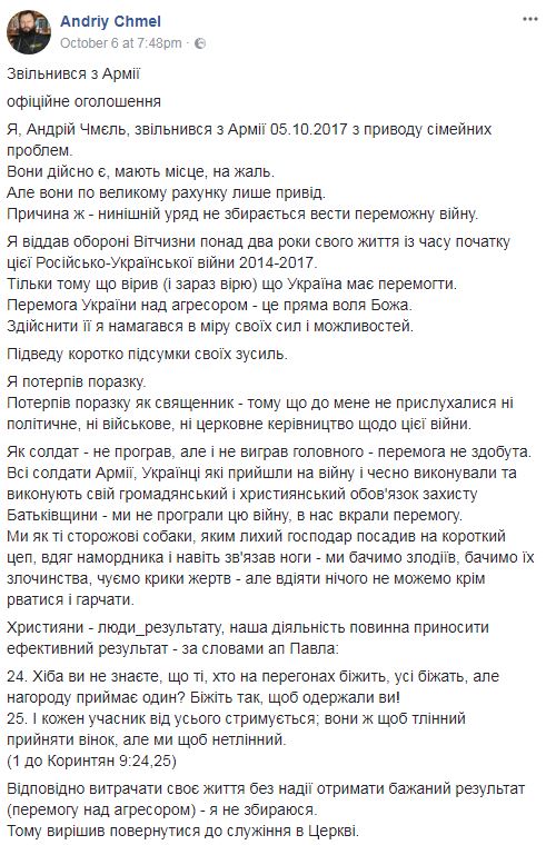 Кроме того Чмель пишет, что увольняется из рядов ВСУ. По его мнению, у солдат "украли победу", превратив их в "сторожевых собак, которых злой хозяин посадил на короткую цепь, надел намордник и даже связал ноги".