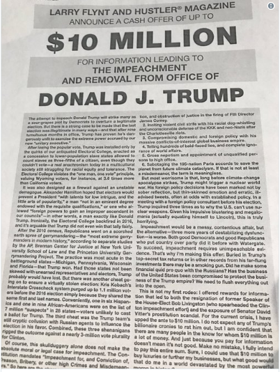 Объявление об этом было опубликовано в газете Washington Post. "Ларри Флинт и журнал Hustler объявляют о предложении до $ 10 млн за информацию, которая приведет к импичменту и смещение с поста Дональда Трампа", - говорится в тексте.
