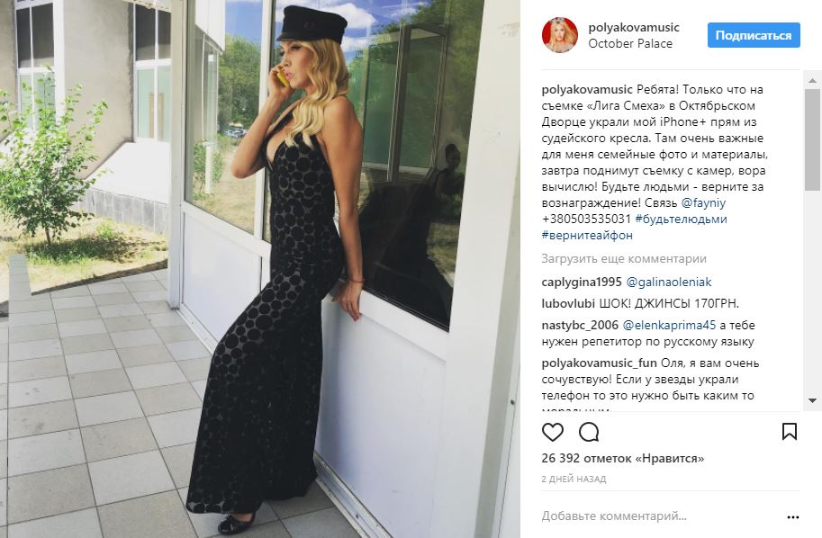 "Там очень важны для меня семейные фото и материалы, завтра поднимут съемку с камер, вора вычислят", – подписала фото Полякова и пообещала вознаграждение за возвращение телефона.