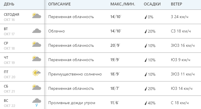 Сайт Weather.com пишет, что в понедельник-вторник ожидается температура +14 днем. Со среды потеплеет до +18...+20.