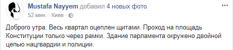 "Доброго утра. Весь квартал оцеплен щитами. Проход на площадь Конституции только через рамки. Здание парламента окружено двойной цепью нацгвардии и полиции", - написал он.