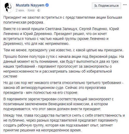 "Глава государства пытается снять с себя ответственность и не публично, через разных представителей предлагает парламенту создать рабочую группу, которая как подсказывает опыт, затянет принятие решения на неопределённое время, - написал Мустафа Найем. - Мы пришли сообщить президенту о готовности авторов законопроекта об антикоррупционном суде отозвать свой вариант закона и получить ответ, когда он готов зарегистрировать свой законопроект об антикоррупционном суде".