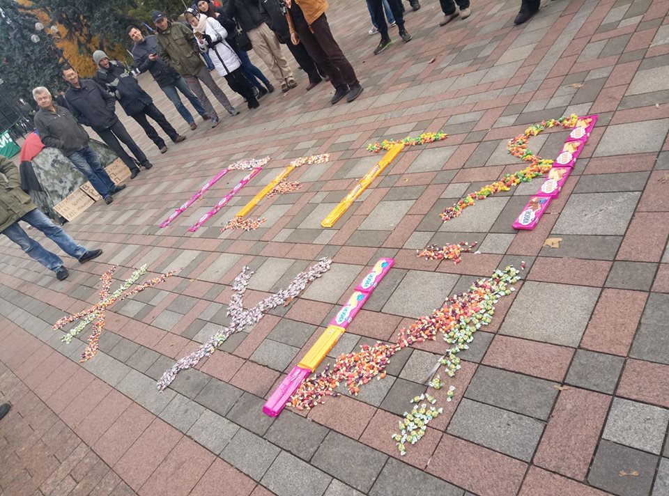 11:23 На площади выложили послание Петру Порошенко. Символично - конфетами Рошен. Активисты даже полупустую площадь используют для выражения свой гражданской позиции. "Петя, жуй!"