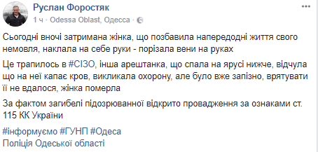 "Сегодня ночью задержана женщина, которая лишила накануне жизни своего младенца, покончила с собой - порезала вены на руках. Это случилось в СИЗО, другая арестантка, которая находилась на нижнем ярусе, почувствовала что капает кровь, вызвала охрану, но было уже поздно", - написал Форостяк.