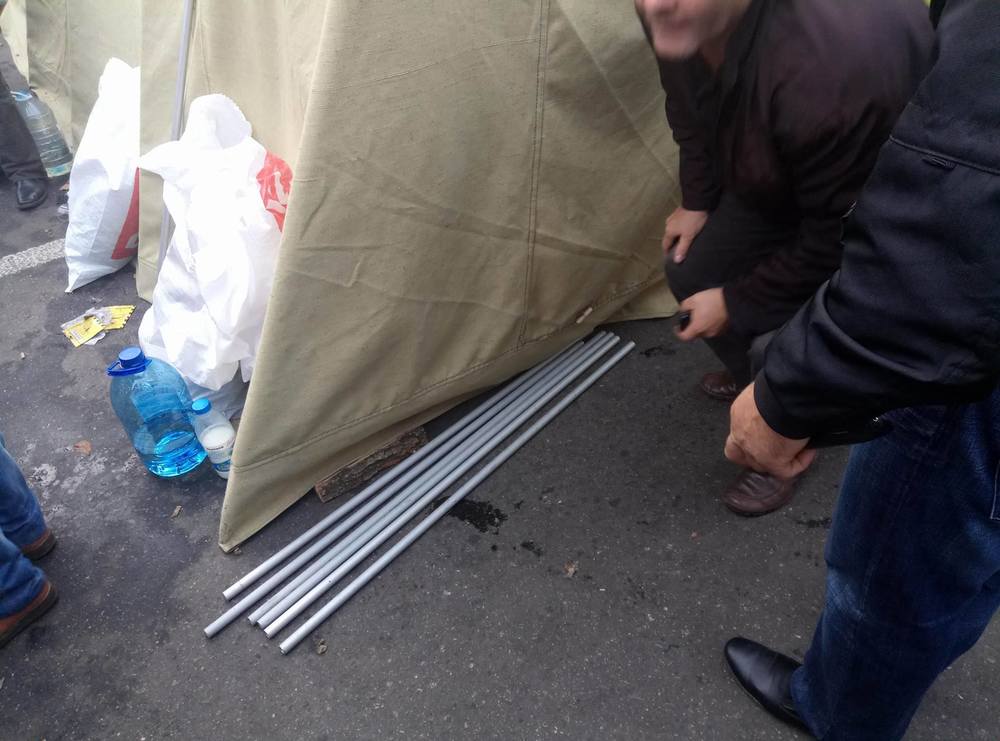 Кроме того, митингующие активизируются. Они складывают палки возле палаток и забора, ломают опоры из-под шатров и созывают крепких мужчин.