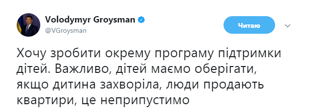 "Хочу сделать отдельную программу поддержки детей. Важно, детей должны оберегать, если ребенок заболел, люди продают квартиры, это недопустимо", - написал Владимир Гройсман.