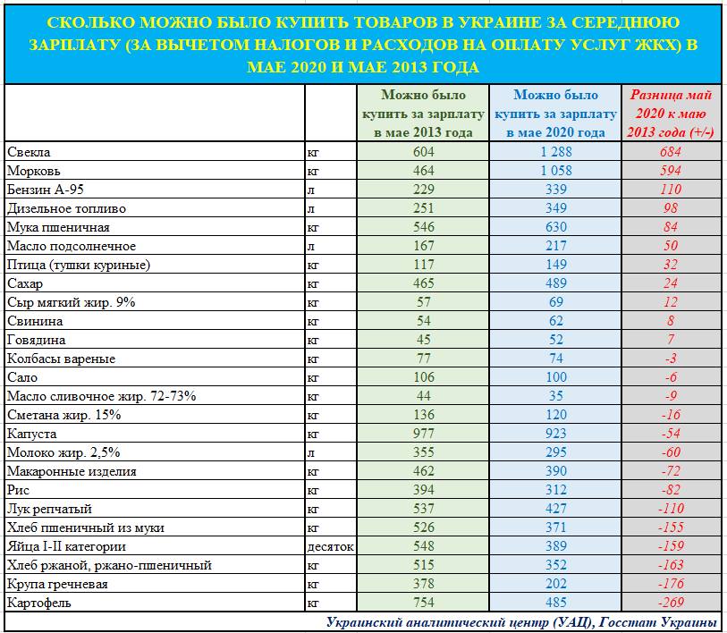Средняя зарплата в Украине в мае 2020 года значительно выше, чем она была в мае 2013 года. Но за это время выросли и цены и налоги. Чтобы показать, как в действительности поменялась ВАША ПОКУПАТЕЛЬНАЯ СПОСОБНОСТЬ, представляет Вам таблицу, которая показывает, сколько Вы могли купить отдельных товаров в Украине в мае 2013 года и теперь в мае 2020 года.