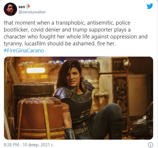 Но 38-летнюю актрису Джино Карано, снимающуюся в сериале "Мандалорец", уволили  даже не за личные заявления - после перепоста чужого сообщения в "Инстаграме". В нем сравнили травлю сторонников Трампа с гонениями на евреев при Холокосте.
