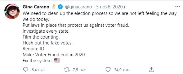 Это не первый раз, когда сообщения Джины в соцсетях вызывают бурную реакцию. Актриса писала, что выборы 2020 года в США сфальсифицированы и требовала положить конец мошенничеству.