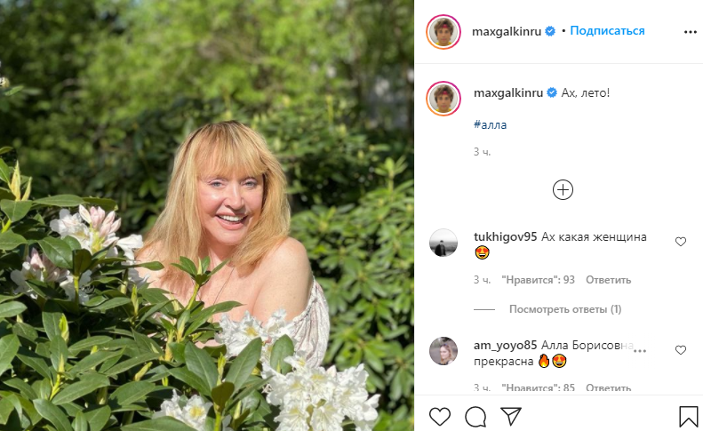 В комментариях пользователи оставили много восхищенных комментариев: "Огооо! Класс", "Как выглядит счастливая женщина, прям огонь в глазах", "Прекрасная Алла", "Какая красавица Алла Борисовна! Вся светится от счастья и любви", "Свежая летняя красотка", "Алла, какая Вы счастливая", "Чудесное фото! Сколько в нём радости и позитива", - пишут пользователи под фото.