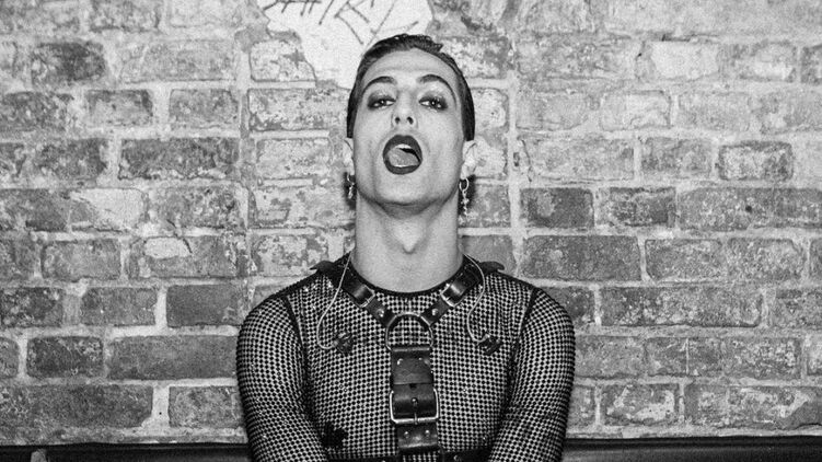 На снимках певец позирует в полупрозрачном наряде в сетку и в кожаных штанах. Изюминкой образа стала кожаная портупея и помада на губах.