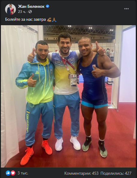 За сутки перед поединком Беленюк опубликовал в своем фейсбуке совместное фото с призывом болеть за спортсменов "завтра" (то есть, 4 августа)
