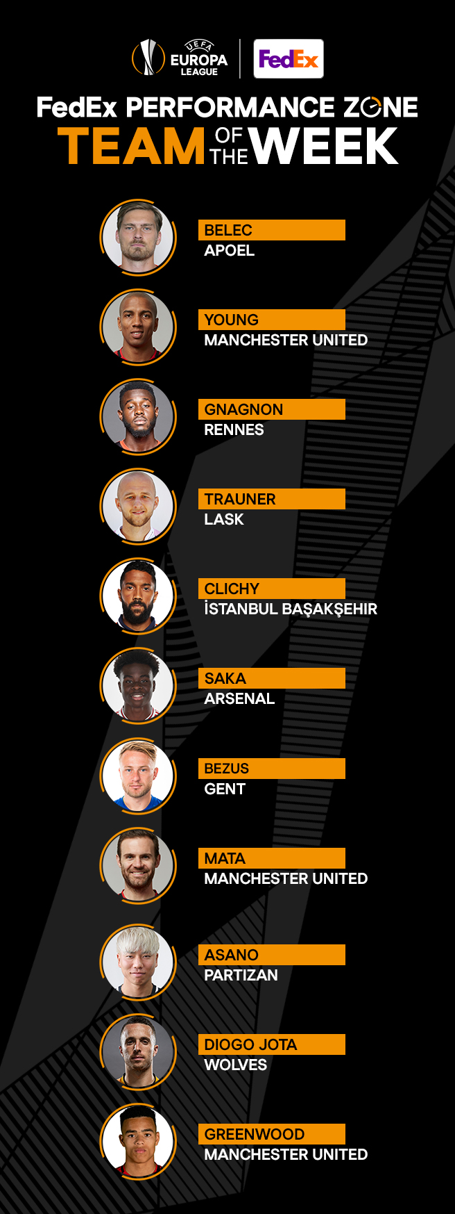 Белец ("АПОЭЛ") – защитники - Янг ("Манчестер Юнайтед"), Ньяньон ("Ренн"), Тройнер ("ЛАСК"), Клиши ("Истанбул Башакшехир") – полузащитники - Сака ("Арсенал"), Безус ("Гент"), Мата ("Манчестер Юнайтед"), Асано ("Партизан") – нападающие Жота ("Вулверхэмптон"), Гринвуд ("Манчестер Юнайтед").