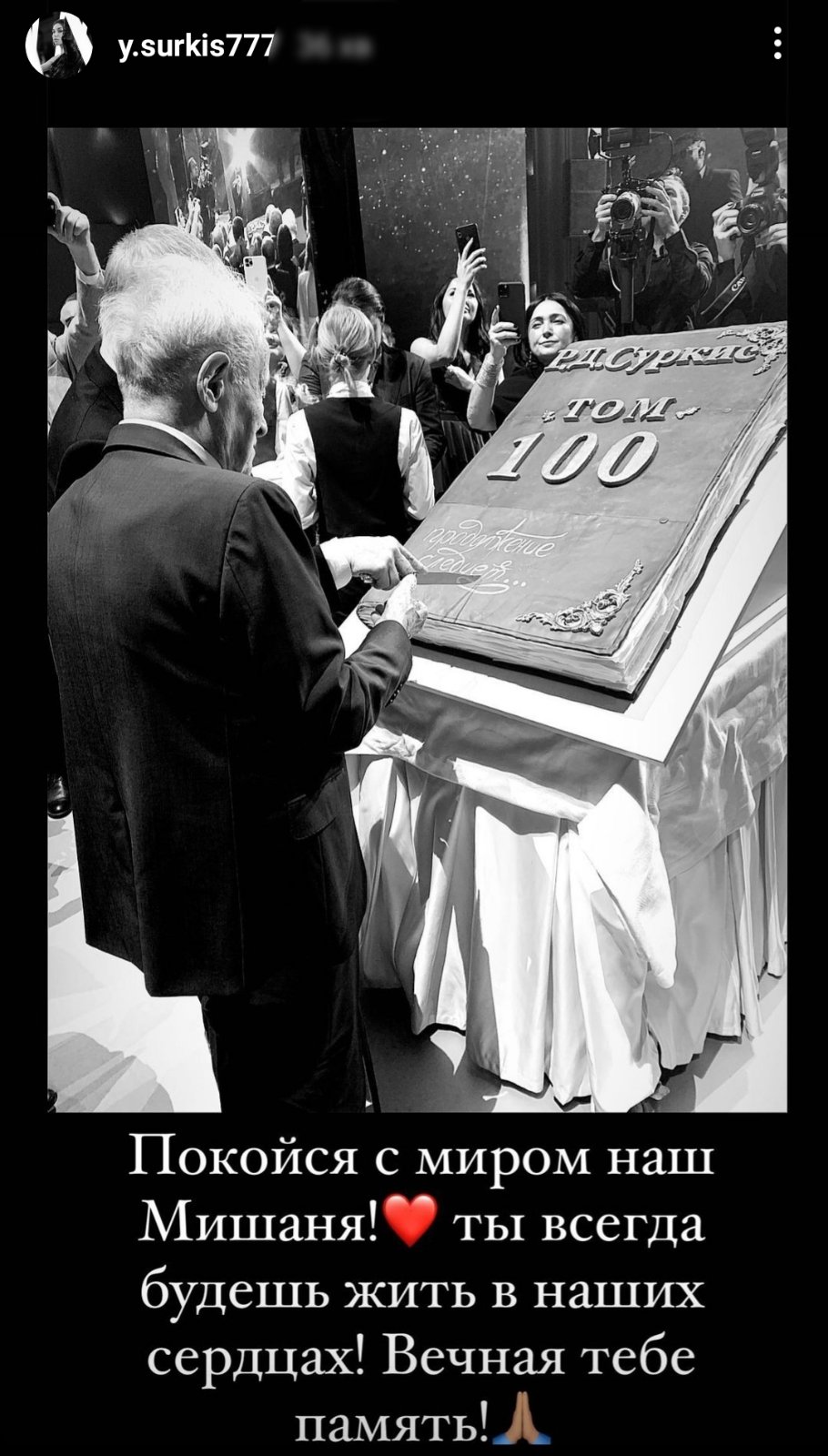 Михаил Давыдович прожил долгую, яркую и достойную жизнь, оставив по себе добрую память. Человек - легенда, которая перешагнула столетний порог, навсегда будет примером жизнелюбия для большой семьи Суркисов, многочисленных друзей и знакомых.