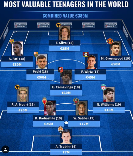 Всего в символической сборной 11 футболистов, чей возраст меньше двадцати лет. Вместе с Трубиным в команду самых дорогих тинейджеров мирового футбола вошли: