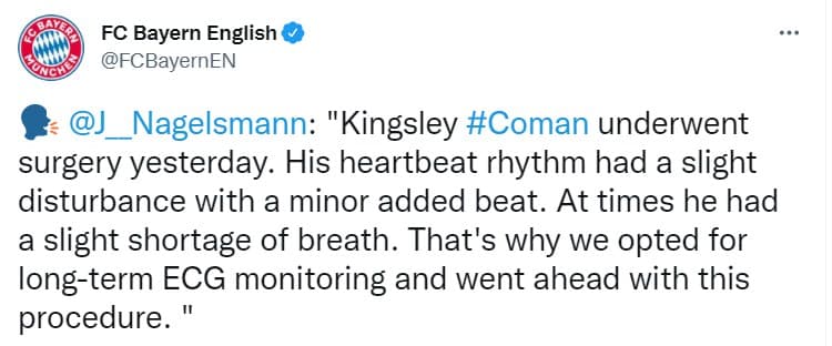 "Кингсли перенес операцию. У него были небольшие проблемы, связанные с нарушением сердечного ритма. Иногда возникали проблемы с дыханием. В связи с этим мы решили провести обследование, которое показало, что нужна операция. Коман приступит к кардиотренировкам. В целом он пропустит от полутора до двух недель", - написал Нагельсманн.