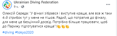 "В финале собрался и выступил лучше, но все-таки четвертый прыжок тут у меня не пошел. Рад, что попал в финал", - цитирует слова Середы пресс-служба украинской федерации дайвинга на своей странице в Facebook.
