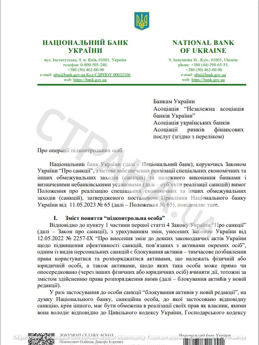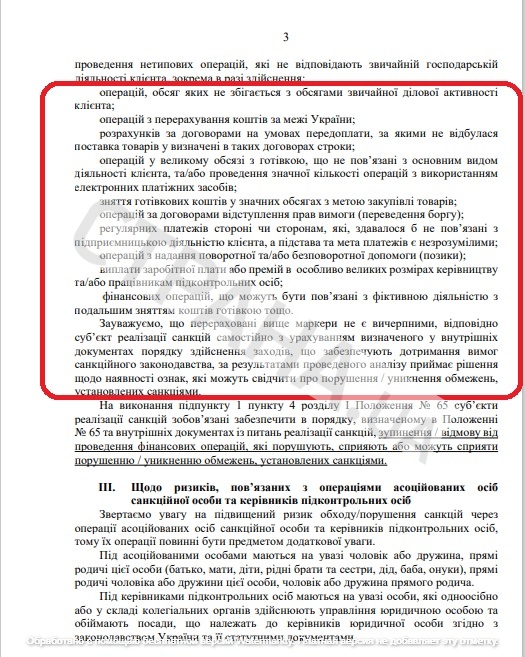 Цей документ присвячений операціям "підконтрольних осіб". До таких осіб регулятор відносить лише суб'єктів господарювання – не фізосіб, а лише бізнес. Який, на думку банків, може мати зв'язок чи підтримувати стосунки з підсанкціонованими особами. Чиновники вважають, що контроль за ними потрібен, щоб підсанкціонники не могли використовувати ці компанії для своїх цілей - щоб користуватися банківськими послугами в обхід санкцій.