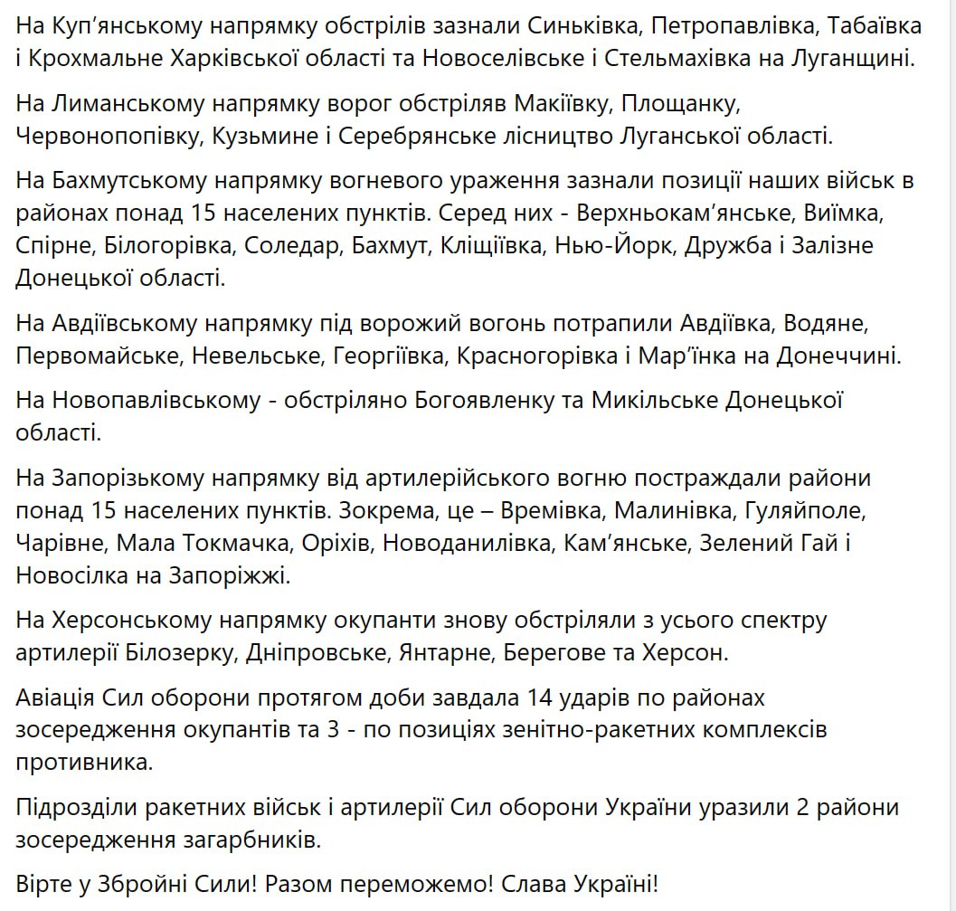 - Росіяни вели безуспішні наступальні дії на Авдіївському та Лиманському напрямах. Продовжують спроби настання на Бахмутському напрямку, збільшують інтенсивність застосування авіації.