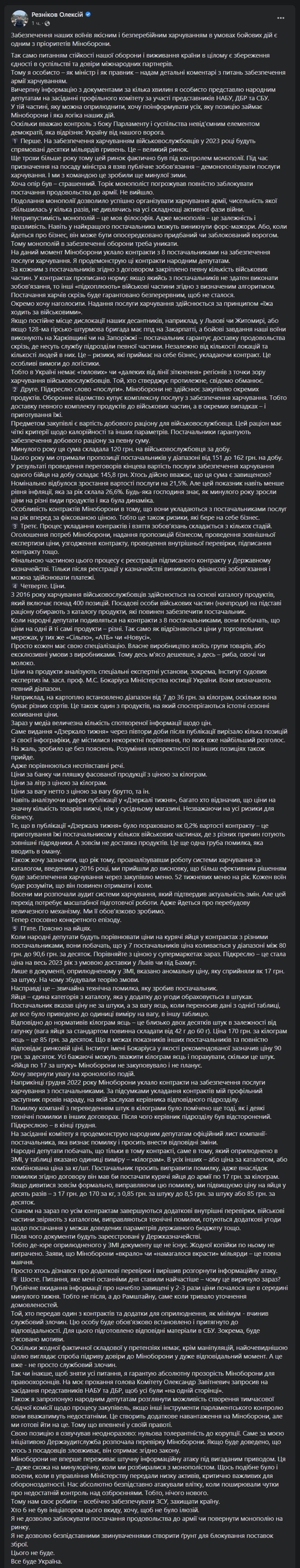 "У документі, оприлюдненому у ЗМІ, зазначено аномальну ціну на яйця, яку сприйняли як 17 грн за штуку. На чому вибудували теорію змови. Насправді це звичайна технічна помилка, яку зробив постачальник. Яйця – єдина категорія з каталогу, яка у додатку до операції розраховується в штуках. Постачальник вказав ціну не за штуки, а за вагу яєць, коли переносив дані з однієї таблиці, де все було приведено в одиницю виміру на вагу, в іншу таблицю", - каже Резніков.