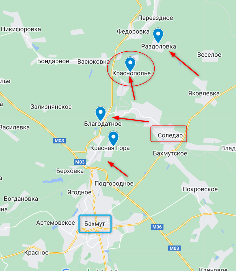 Російські військові блогери пишуть про те, що після передбачуваного захоплення Краснополовки російські сили атакують у напрямку Роздолівки на північ від Соледара і Благодатного на заході. Також тривають бої за Червону Гору.