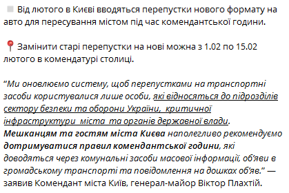Замінити перепустку на нову можна з 1 по 15 лютого в комендатурі Києва.