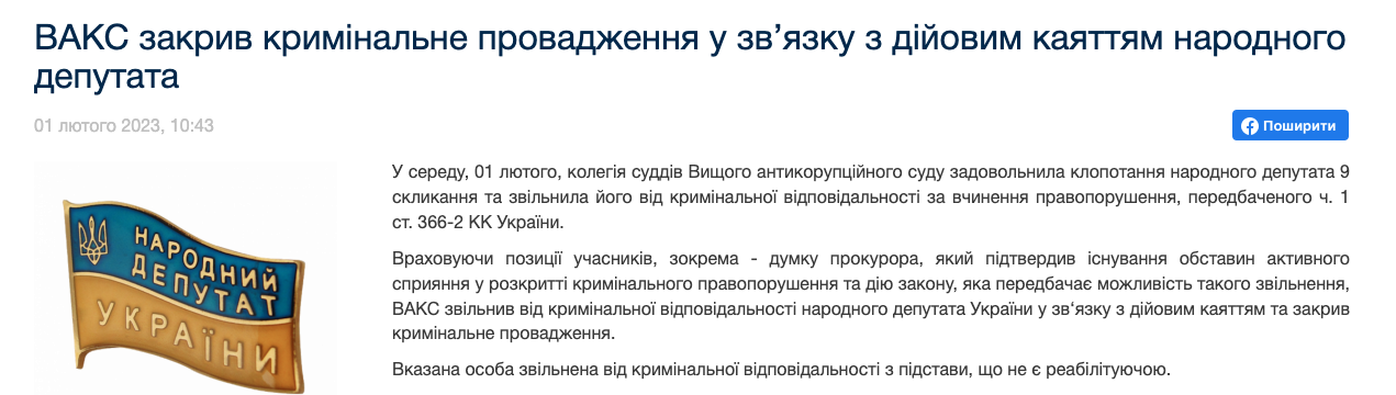Проте колегія суддів ВАКС задовольнила клопотання Гевка та звільнила його від кримінальної відповідальності за скоєння правопорушення.
