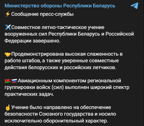 "Спільне льотно-тактичне навчання збройних сил Республіки Білорусь та Російської Федерації завершено", - йдеться у повідомленні.
